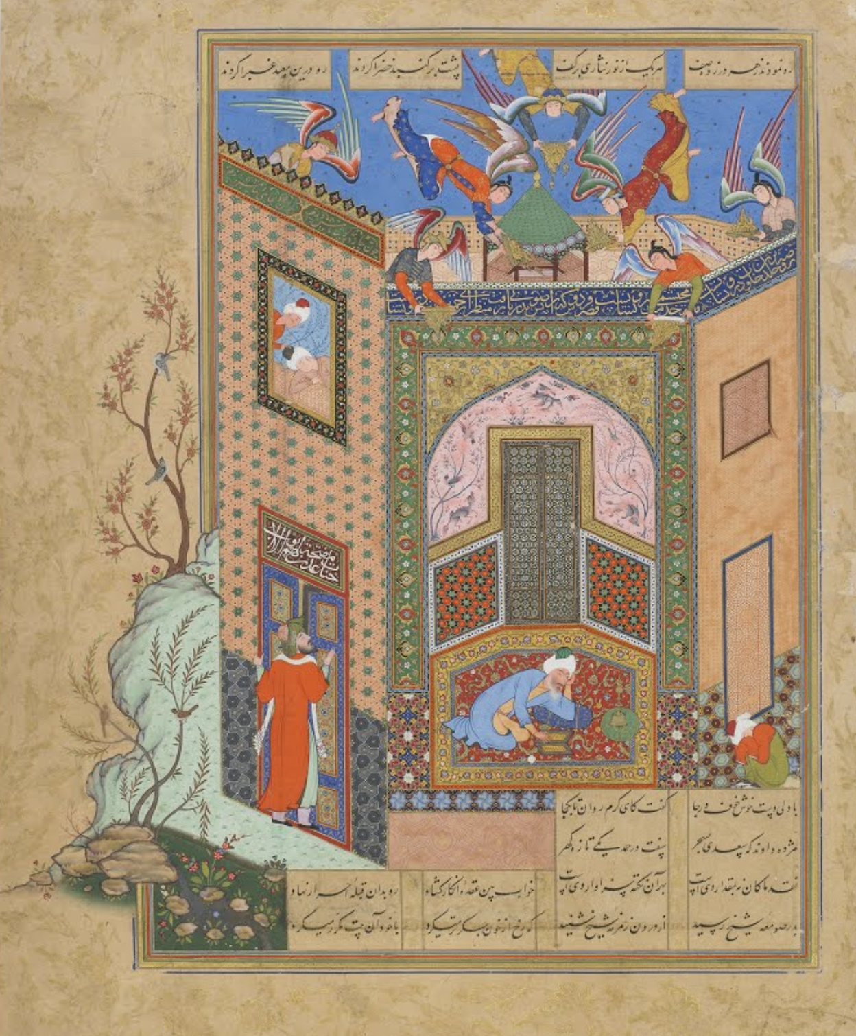 Fig 7: Oblique perspective drawing from “Seven Thrones” by Jami (d.1492); recto: the gnostic has a vision of angels carrying trays of light to the poet Sa'di. The image demonstrates the use of pattern language, scale and density to represent shadows and depth found in 3D space.