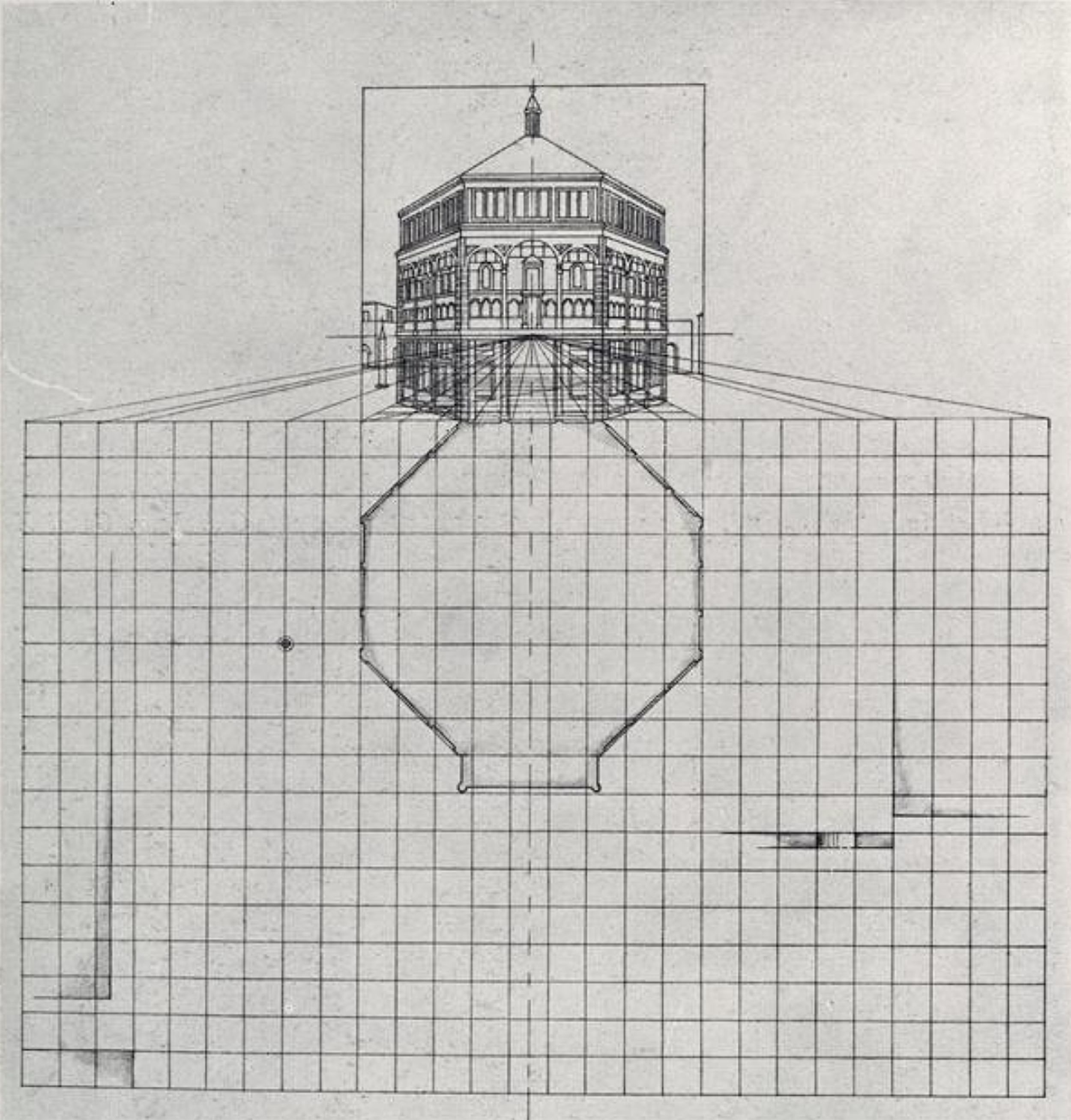 Fig 10: Schematic representation of Filippo Brunelleschi's first perspective drawing technique of the Battistero di San Giovanni, 1415