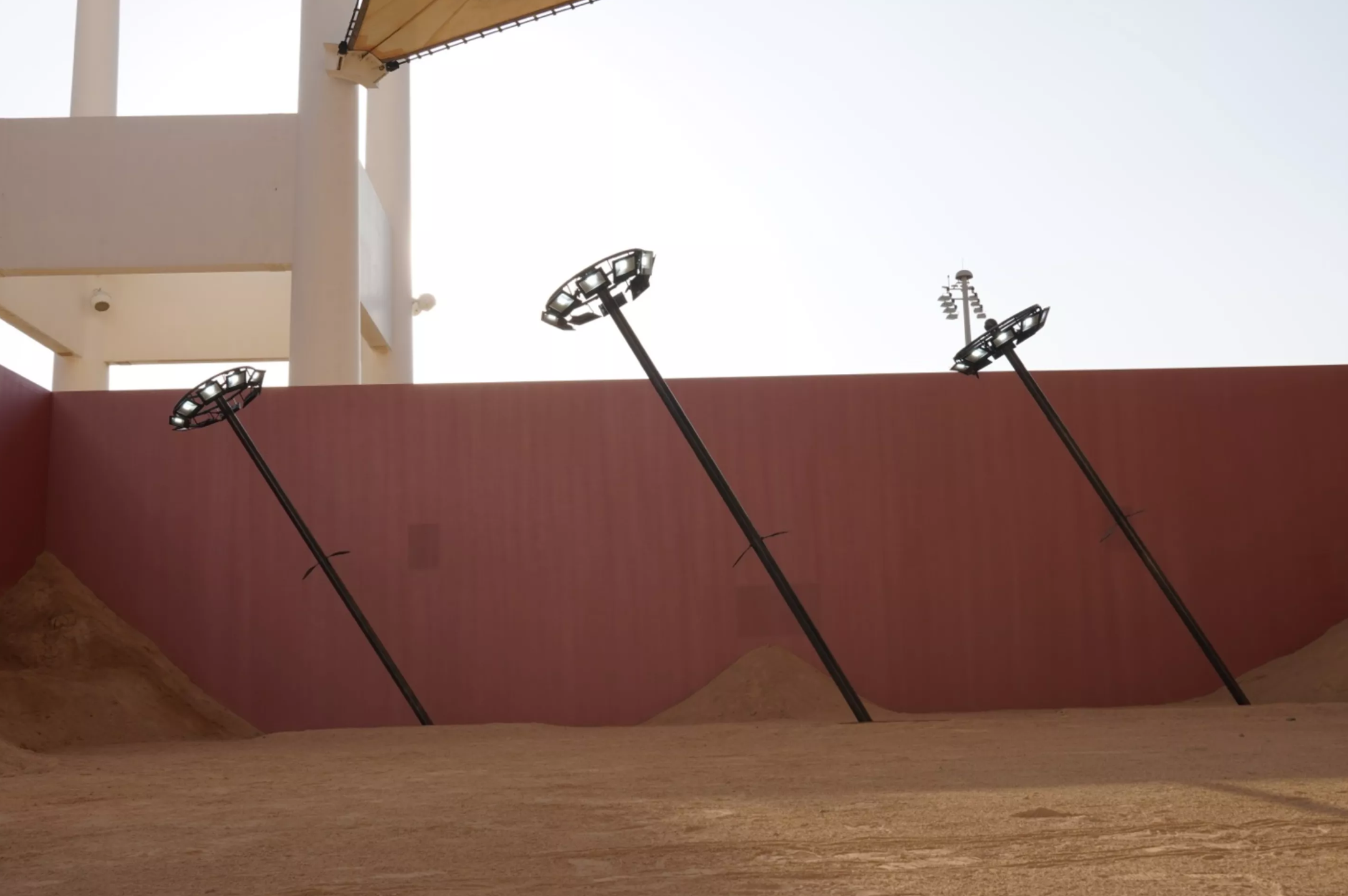 Finally, the work of Wael Shawky In the Sound of the Muzdalifah conjures the metaphysical, ephemeral, and ineffable aspects of spiritual practice within a visual landscape of industrial artifacts. In reference to a childhood memory of Mecca, three steel lampposts are set in a landscape of fragile sand, they move like reversed pendulums troubling the viewers concept of gravity and the normative. The industrial lampposts, paired with Noura Alsayeh’s Friday Sermon seem to be swaying to the rhythms of Friday sermons and speaking to the temporal landscape of Muzdalifah.