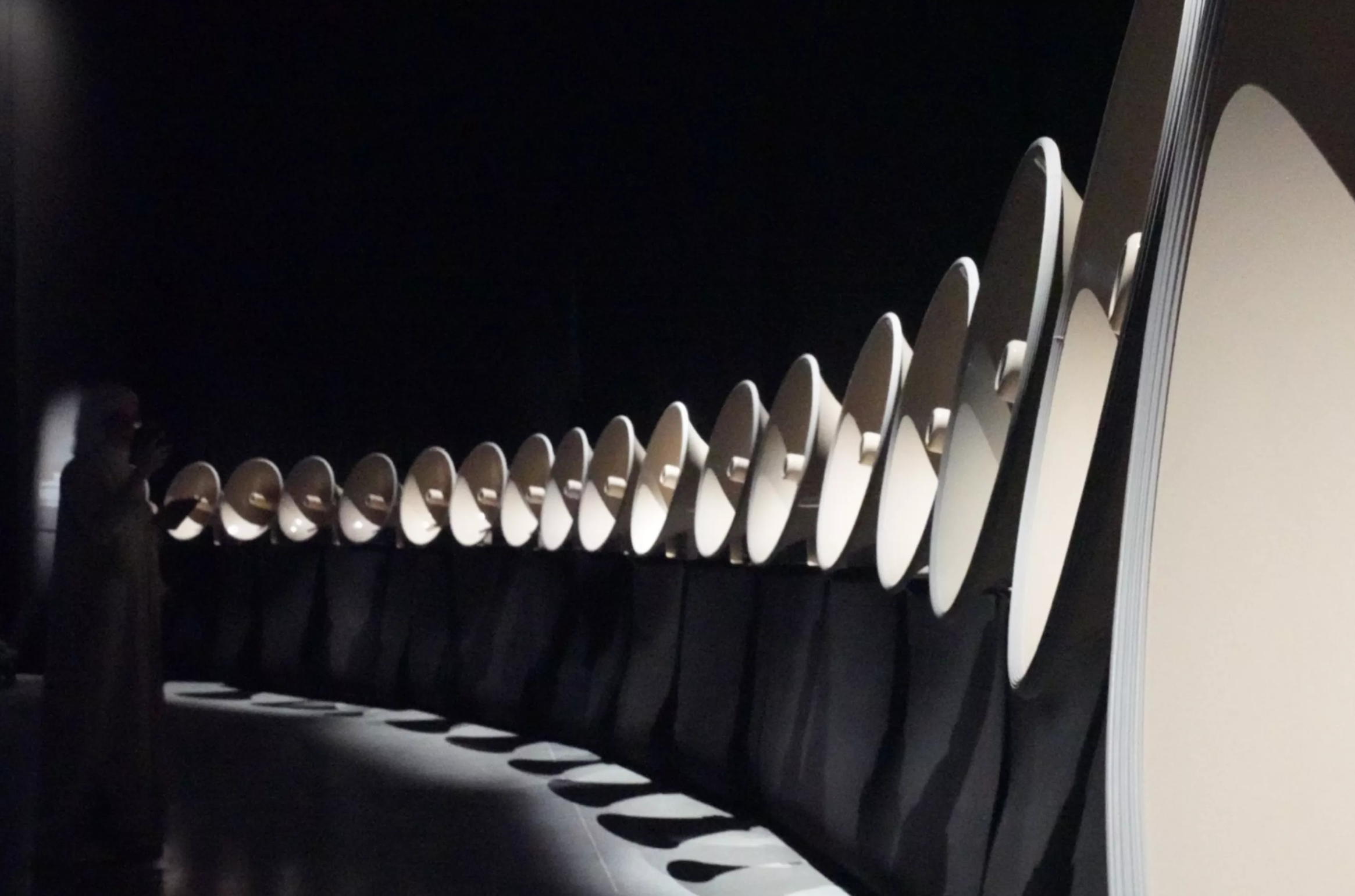 Within the framework of a biennale with over 400 contemporary artworks and historic artifacts, the pairing of Joe Namy’s Cosmic Breath soundscapes with Nora Alissa’s Epiphamania: The First Light hazy projections is a testament to the success of the curatorial experience. Joe Namy subverts the use of techno-tools in ritualistic performance, through an installation of 18 loudspeakers reverberating and indexing Adhan, Islam’s call-to-prayer, traversing 18 geographic locations and 200 years of Islamic worship. The sound bits echo on the façade of the photographic projections by Norah Alissa, giving their blurry qualities a sense of life and rhythm. Inhabiting the circular volume of space between Joe and Norah feels like inhabiting the space of spiritual practice, the space of the Kaaba.