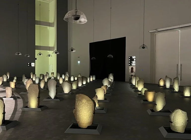If Joe Namy hacks the technological in his creative commentary, then Sara Abdali’s After Hijrah hacks the archival. Situated at the tail-end of Gallery One, amongst historic scriptures and Haroom Gunn-Salie’s embodied funerary work, the curators bring life to archeological remains of death (basalt tombstones from Mecca’s Al-Ma’la cemetery) by invoking presence through Sara Abdali’s work: an overlay of oral soundscapes of the deceased’s personal histories. Here, one is brought to silence, by both the scenographic layout of a cemetery within a biennale exposition, and by the ability of artists, curators, and scenographers to enliven historical artifacts.